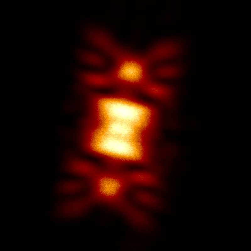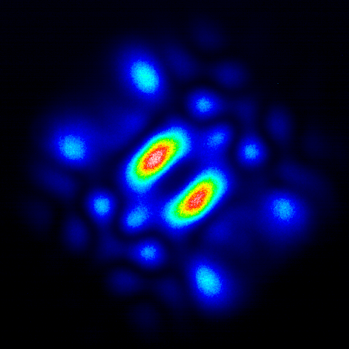 A custom beam profiler for laser beams with complex internal structure was developed. The instrument employs a relay-imaging configuration combined with a special averaging algorithm to eliminate speckle patterns caused by scattering on the input screen. The images on the right demonstrate measurements of actual laser beams. Note the total absence of interference-induced artifacts, which is rarely achieved with conventional CMOS-based beam profilers and allows one investigating coherent beams with complex multi-spot structure. Another application is measuring large-aperture beams of sub-TW and TW femtosecond lasers. Such lasers are designed to have large beam diameters to adapt to current LIDT limits of compressor gratings (typically a few hundreds of mJ/cm^2 for holographic gratings in Ti:Sapphire domain), and beam-delivery issues caused by small-scale self-focusing.