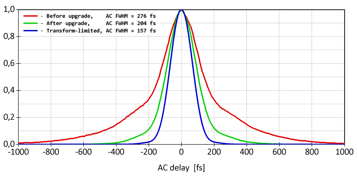 Pulses (autocorrelation functions) of a fiber CPA system after an upgrade of the dispersion-control sub-systems