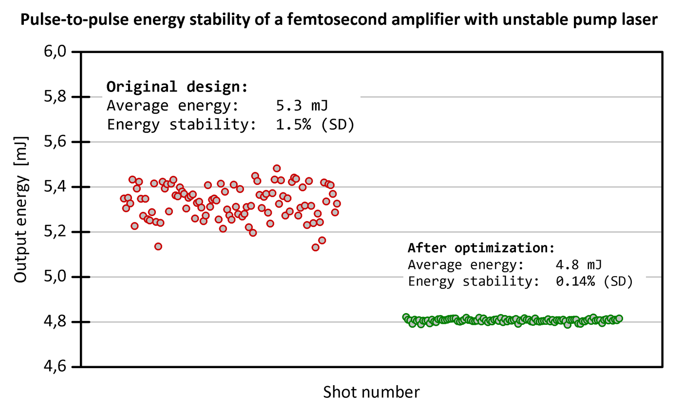 A commercial femtosecond amplifier was paired with a cheap pump laser that exhibited poor pulse-to-pulse stability in terms of both energy and beam pointing. The goal was to improve the performance of the amplifier with the existing unstable pump source. After optimization and some upgrade of the amplifier, the pulse-to-pulse energy stability of the system improved from 1.5% to 0.14% (SD). This tenfold improvement was achieved with a minimal 10% trade-off in the output energy.