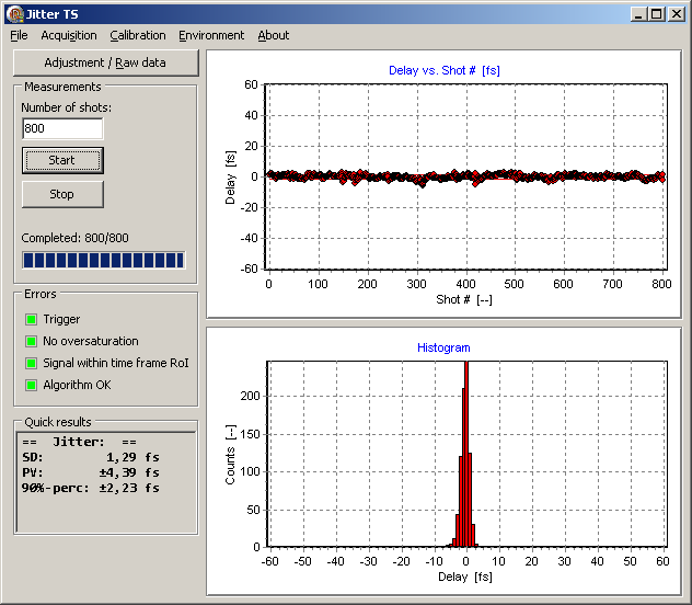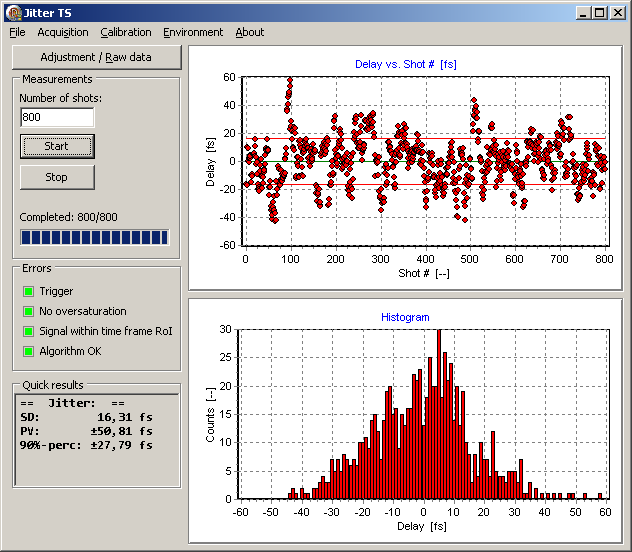 A custom instrument to measure the cross-jitter between two locked femtosecond lasers was developed. The images on the right demonstrate a sample measurement of the relative timing jitter between output pulses from two CPA systems (each delivers 42 fs pulses at 800 nm with millijoule-level energy at 10 Hz). The data indicates synchronization within ±17 fs (SD). The intrinsic noise of the instrument (i.e. the jitter introduced by the instrument itself, when it is seeded with two replicas of the same laser pulse) is ~1.5 fs, ensuring that measurements reflect the actual performance of the lasers.